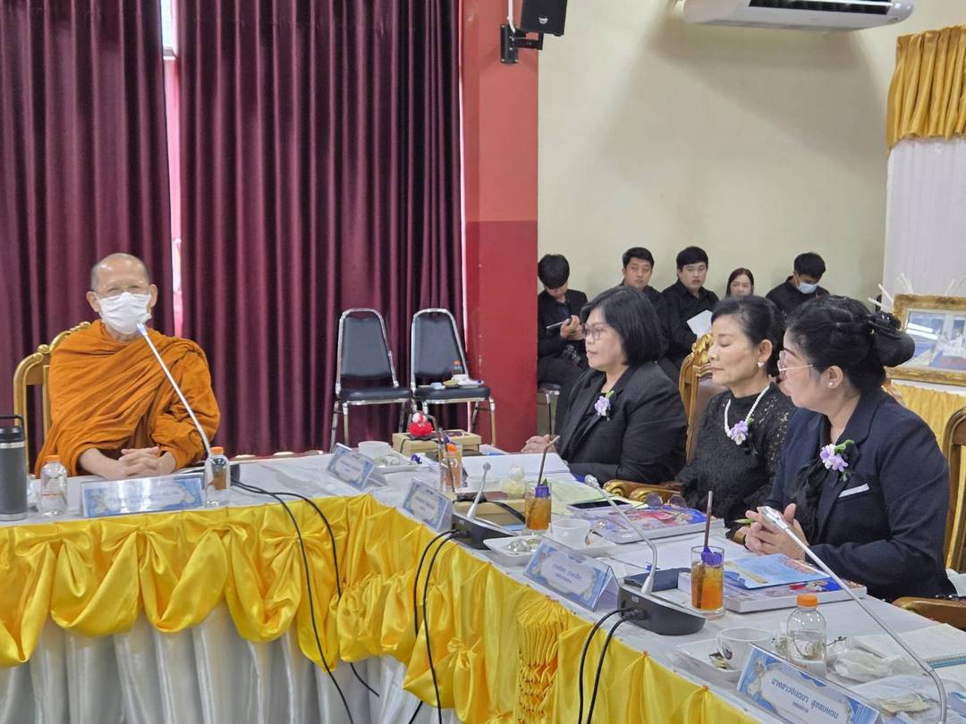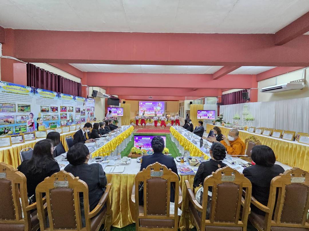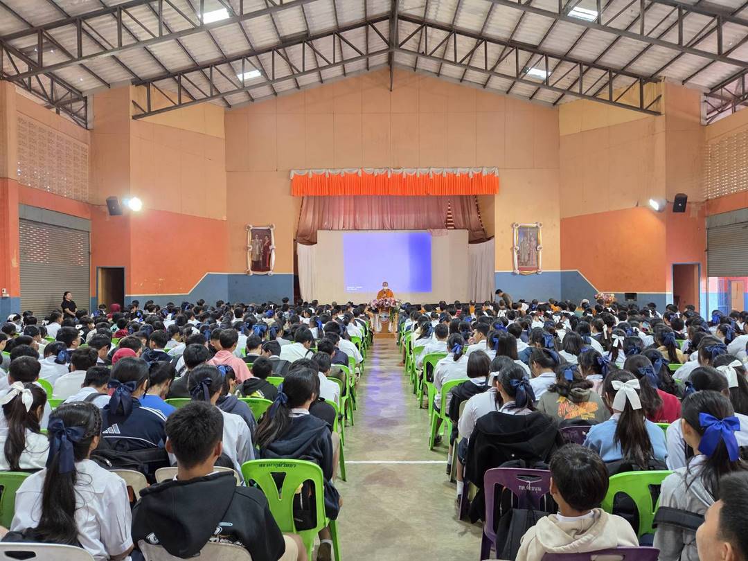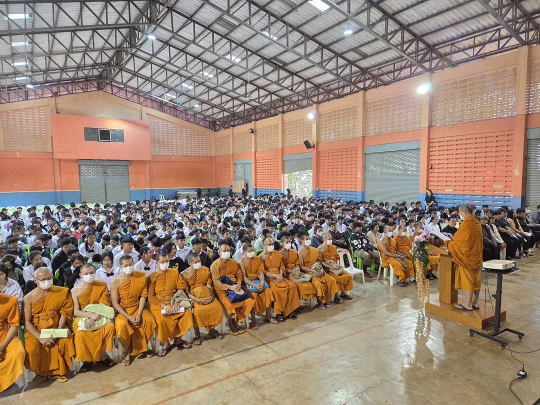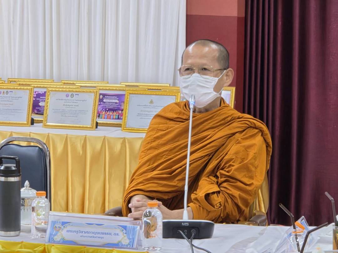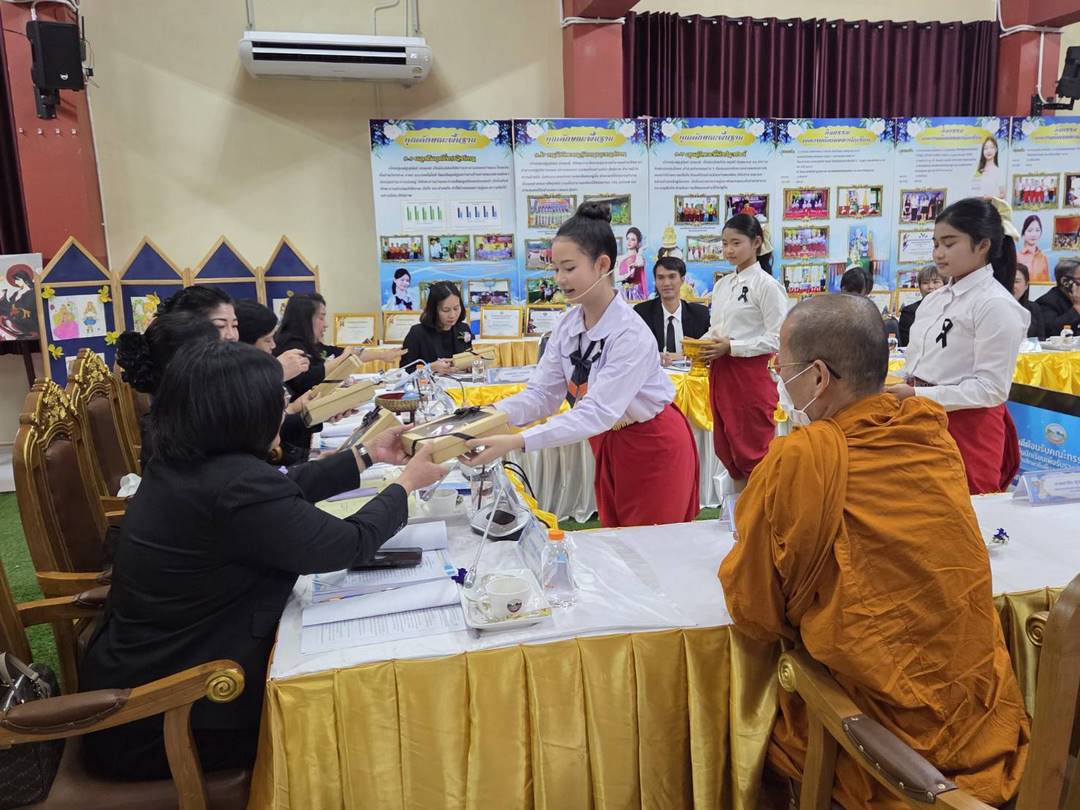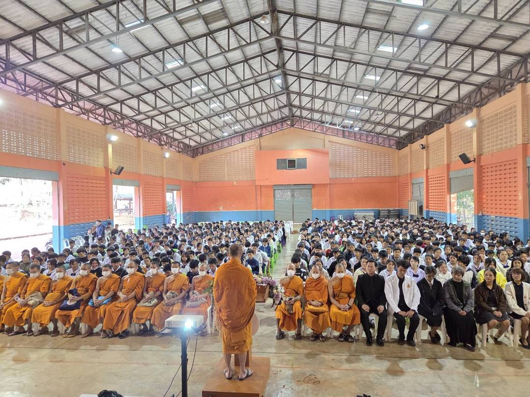 พระครูวิลาศกาญจนธรรม, ดร. เจ้าอาวาสวัดท่าขนุน ที่ปรึกษาเจ้าคณะจังหวัดกาญจนบุรี ประธานสนามสอบธรรมศึกษาโรงเรียนทองผาภูมิวิทยา อ่านสาส์นจากแม่กลองธรรมสนามหลวงและให้โอวาทแก่คณะกรรมการและผู้เข้าสอบ ในพิธีเปิดการสอบธรรมศึกษา (สนามหลวง) ประจำปี ๒๕๖๘ ณ ห้องประชุมใหญ่ โรงเรียนทองผาภูมิวิทยา หมู่ที่ ๑ ตำบลท่าขนุน อำเภอทองผาภูมิ จังหวัดกาญจนบุรี